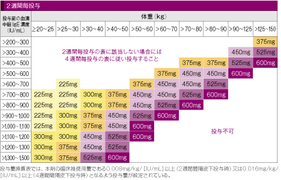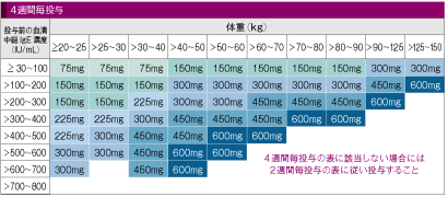 「体重」と「投与前の血清中総IgE濃度」の交わったところが投与量となります。